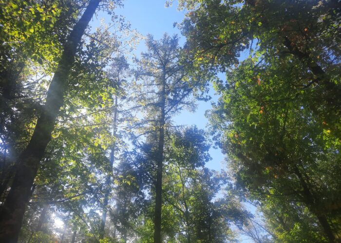 Sehr schön ist ein tönernes Schild an der Mauer an einem der letzten Grundstücke am Ortsausgang: „Buen camino“ – das finde ich so zauberhaft, ich bin ganz gerührt. Dann geht’s weiter durch den Wald. Hier gibt es auch einen Zahlenweg, wie ungewöhnlich! Doch ich gehe jetzt weiter nach Allersberg. Das Wetter ist immer noch schön, der Wald ist hier beidseits des Weges eingezäunt, wahrscheinlich sind es Schonungen. Unterwegs begleitet mich nach wie vor die Muschel. Ein bisschen Herbstlaub ist auch schon zu sehen, von der Sonne golden angestrahlt, und die Vögel zwitschern. Vorhin habe ich im Wald ganz oben in den Bäumen einen Specht intensiv hämmern gehört. Zu sehen war er natürlich nicht, aber sehr laut. Ansonsten befürchte ich, dass ich manchmal laut bin, weil ich ein bisschen Musik im Kopfhörer habe und bei manchen Sachen – es passiert einfach so – mitsinge. Die Rehe und Wildschweine in meiner Nähe kennen jetzt also den Text von Another Brick in the Wall.