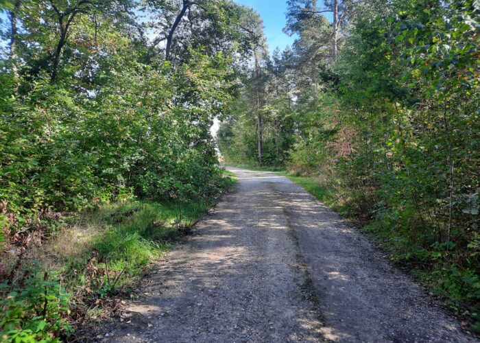 Jetzt habe ich doch tatsächlich mitten im Wald eine Bank gefunden. Gegenüber steht ein Gebäude, das etwas mit dem Wasserschutzgebiet zu tun haben könnte. Inzwischen bin ich auf dem Weg von Harrlach nach Allersberg, es kann nicht mehr allzu weit sein. Ich höre eine Straße, der Weg ist sehr schön gewesen und ich nehme jetzt mal wieder die Musik aus meinen Ohren. Die Blätter rauschen, die Schmetterlinge wurden von Libellen abgelöst, die über den Weg hüpfen. Ja, und ich bin ganz begeistert, denn seit ich so viel Gewicht verloren habe, kann ich auch wieder ohne Probleme bergauf gehen. Der Weg nimmt gerade eine kleine Steigung. Früher hatte ich gedacht, mein Gott, wie überlebe ich diesen Berg. Heute denke ich, mal sehen was man von da oben aus sehen kann. Ich hatte ja auf den See gehofft, aber das hat noch nicht geklappt.
