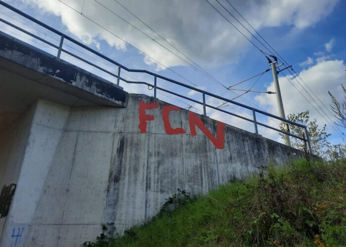 Zwischen den Maisstoppeln habe ich dann auch noch eine Elster aufgescheucht. Die Landschaft sieht, nachdem der Mais geerntet wurde, tatsächlich völlig anders aus. Biegt man hier um die letzte Ecke und blickt auf Furth, sieht man all die Häuser, die sonst hinter dem Mais verborgen waren. Ein ganz anderer Eindruck. Ein wirklich netter, fast talähnlich gelegener Ort, obwohl hier natürlich keine Berge sind. Aber es geht ein bisschen in eine Mulde hinab. Und in einem Garten am Ortsrand weht auch wieder die Fürthflagge, was ich in Furth sehr lustig finde. Ja, jetzt hole ich meinen Kaffee aus dem Gepäck und trinke einen Schluck, esse ein Käsebrot und dann geht es weiter nach Harrlach. Ich muss jetzt auf meinem Streckenplan Nürnberg – Eichstätt prüfen, wo es langgeht, aber ich bin gut vorbereitet, habe alles digital und analog dabei. Man weiß ja nie, ob überall ein Netz zur Verfügung steht.
